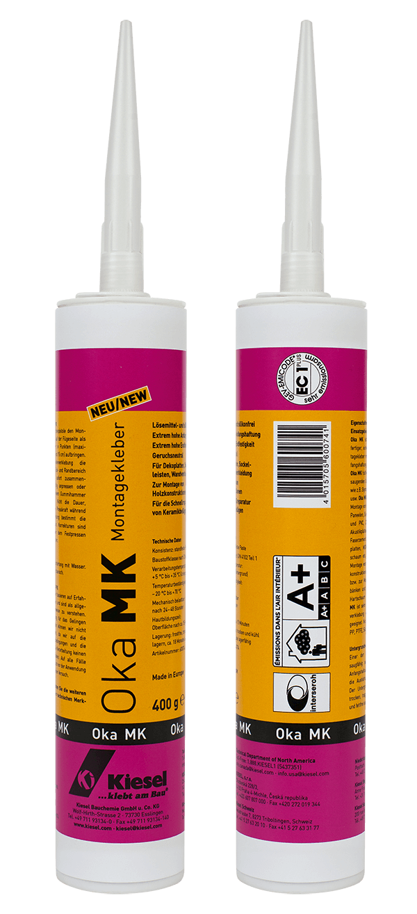 Kiesel Oka MK is een gebruiksklare, één componentige, veelzijdige montagelijm met een extreem hoge aanvangshechting en eindsterkte. Kiesel Oka MK hecht op alle gangbare, zuigende ondergronden in de bouw, zoals piepschuim, hout, steen, gips etc. Kiesel Oka MK is geschikt voor het plaatsen van wandbekleding, panelen, plinten van hout en PVC, isolatie, decoratieve en akoestische panelen, kabelgoten Vezelcement, cellenbeton, spaanplaat, MDF-platen, PU-hardschuim, enz. Kiesel Oka MK kan worden gebruikt voor de montage van houten of betonnen constructies of voor de montage van vensterbanken en decoratieve onderdelen van PU-hardschuim of polystyreen.