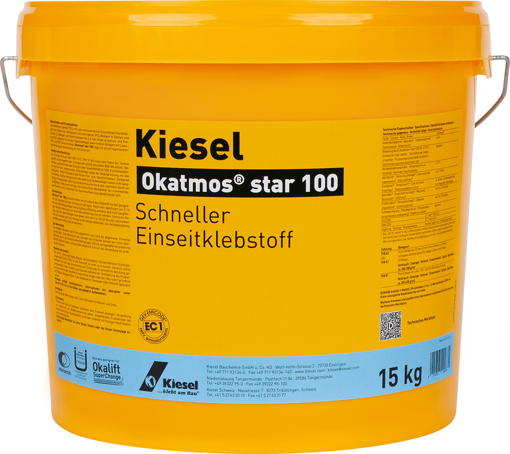 Kiesel Okatmos® star 100 is een oplosmiddelvrije, zeer emissiearme, enkelzijdige dispersielijm voor het verlijmen van homogene en heterogene PVC-bekledingen in banen en tegels, CV-bekledingen en rubberbekledingen tot 4,0 mm dik in banen en tegels (niet geschikt voor speciale/specialistische bekledingen) en textielbekledingen met latex-, PVC- en PUR-schuimrug. Kiesel Okatmos® star 100 is in de systeemopbouw met de Valutect isolatiefolie getest en voldoet in deze context aan de eisen van de noodzakelijke gasdichtheid bij de sanering van verontreinigde ondergronden.